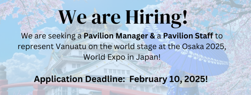 We are seeking a Pavilion Manager and dedicated staff with strong organizational skills, teamwork, communication, and a passion for representing Vanuatu on the world stage at the Osaka 2025, World Expo in Japan!
